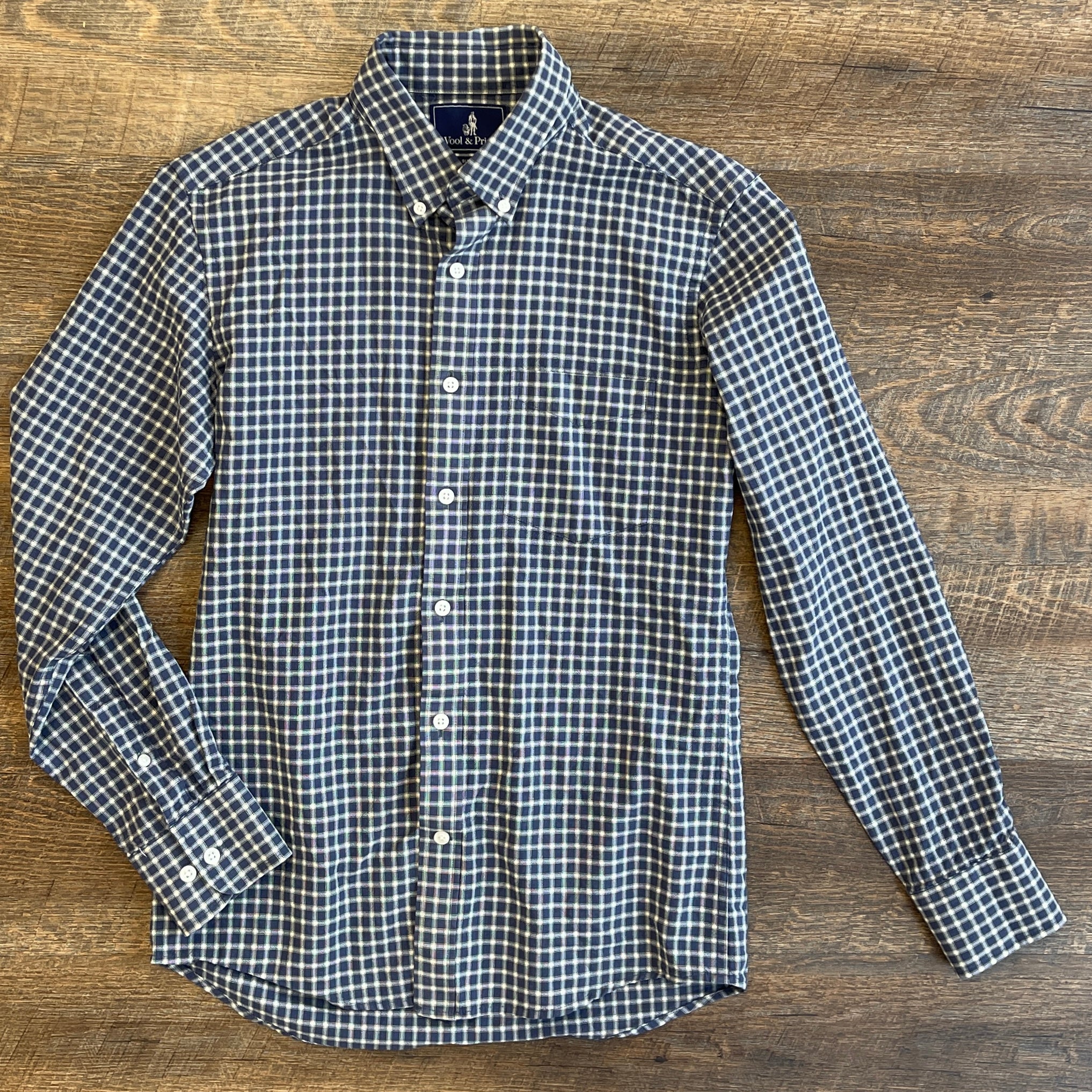 Wool & Prince Plaid Navy Button Down Shirt, Men's Small